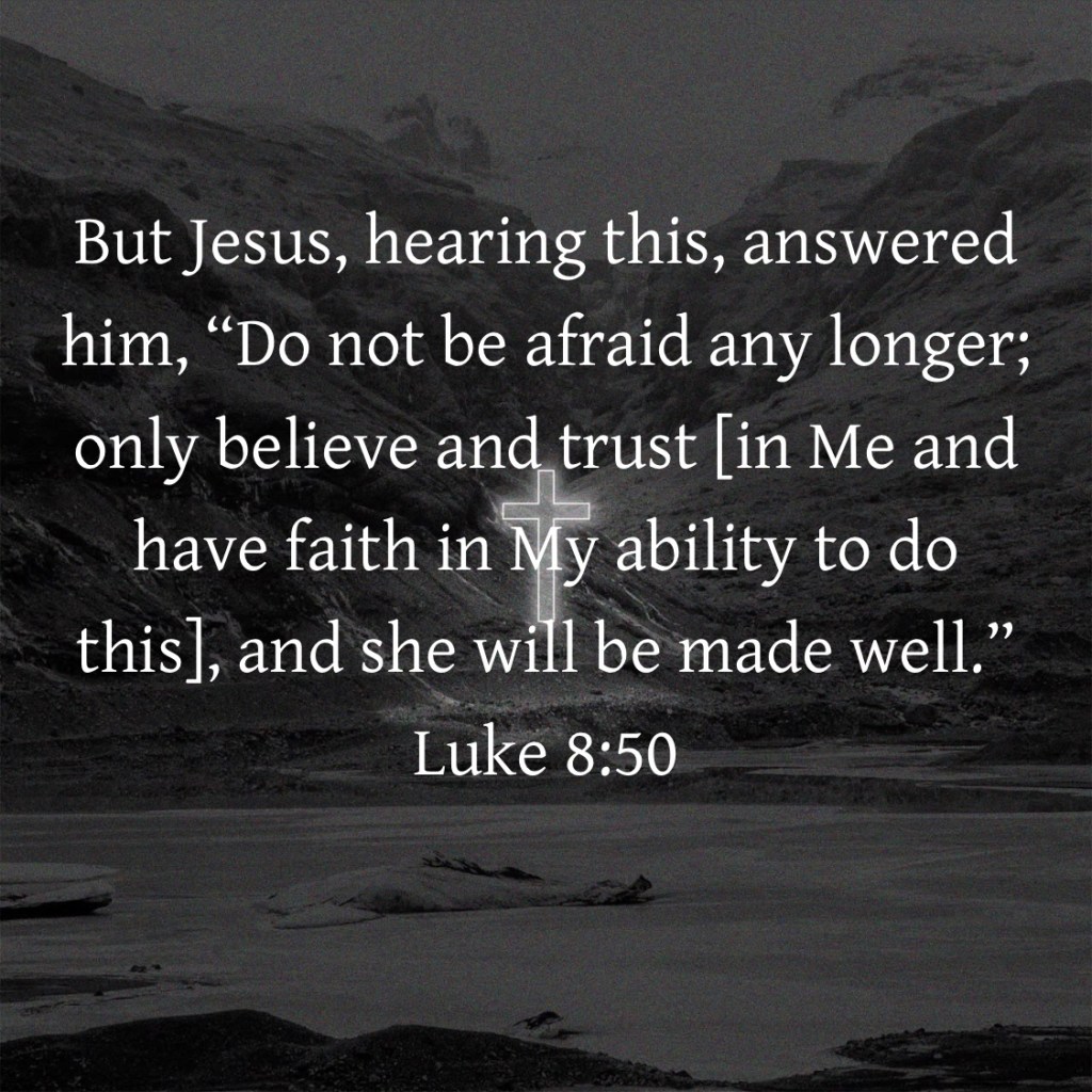 “Overhearing what was being said, Jesus said to the synagogue official, “Do not be afraid; only keep on believing [in Me and my power].”